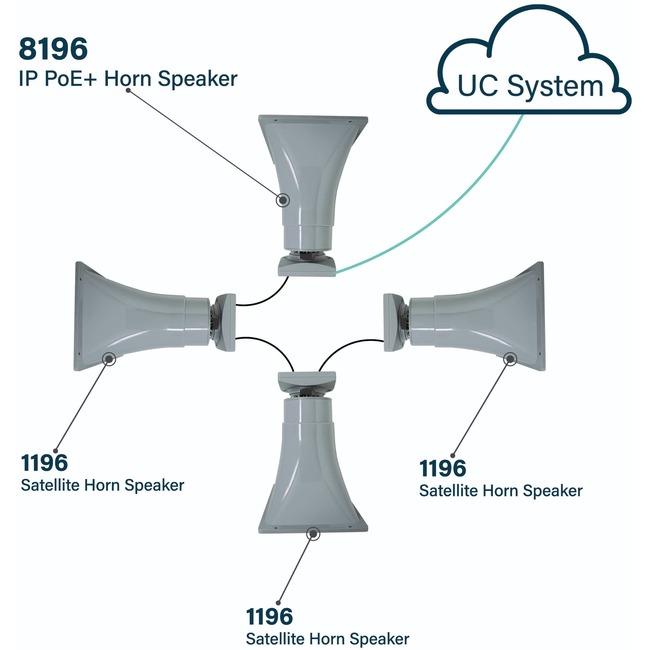 For expanded coverage, up to three satellite speakers may be connected to the 8196 speaker sharing the 16W of available audio power. The 8196 IP PoE+ Horn Speaker can provide significant savings when combined with one or more 1196 satellite speakers. Satellite speakers are connected to the 8196 in a daisy chain fashion using CAT5/CAT6 standard patch cables. Each 1196 Satellite Speaker attached is detected by the 8196 IP Speaker automatically and can be monitored for connectivity. The number of attached satellite speakers is displayed in the 8196 web GUI and also visible in the 8300 Supervision Controller, if deployed.